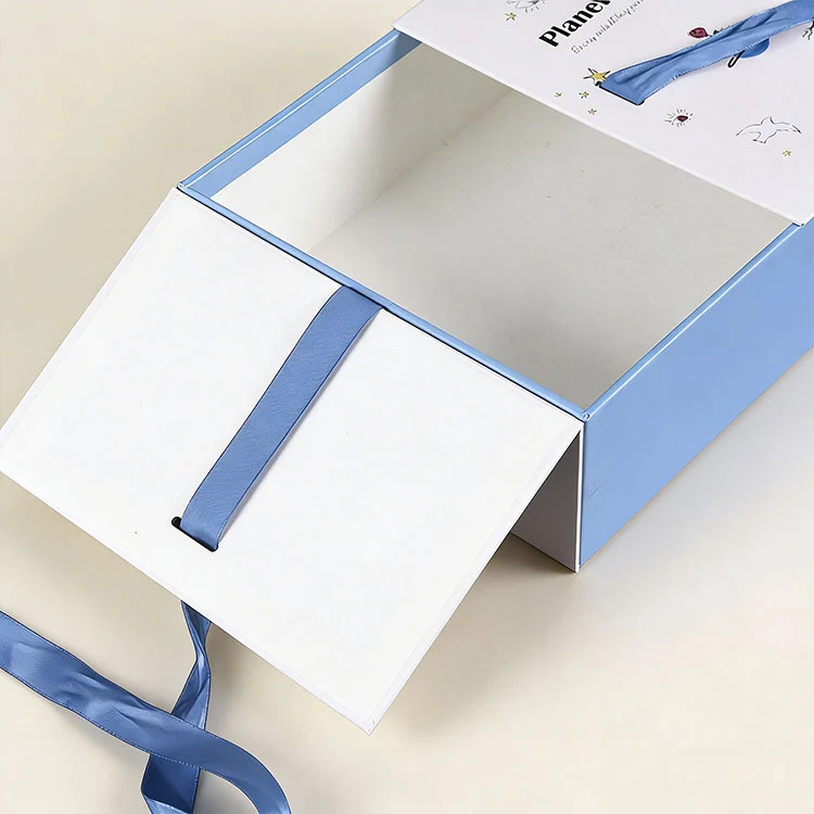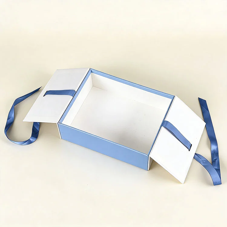 Składane pudełko z podwójnym otwieraniem przyjmuje symetryczną konstrukcję z podwójnym otwieraniem, która różni się od tradycyjnej konstrukcji z pojedynczą pokrywką. Otwiera się i zamyka płynnie i jest wygodny w użyciu. Jednocześnie wygląd jest regularny i symetryczny. Jest bardziej wykwintny dzięki dekoracji wstążki, a ekspozycja na półce i prezentacja prezentów bardziej przyciągają wzrok. Składana konstrukcja może skompresować korpus pudełka do minimalnej objętości, oszczędzając miejsce do przechowywania i transportu, a także można go szybko złożyć bez użycia narzędzi. Zagięcie wykonane jest z materiału o dużej wytrzymałości, który nie jest łatwy do uszkodzenia i odkształcenia po wielokrotnym złożeniu. Uwzględnia wygodne przechowywanie, tani transport i wysoką wartość nominalną oraz praktyczność.